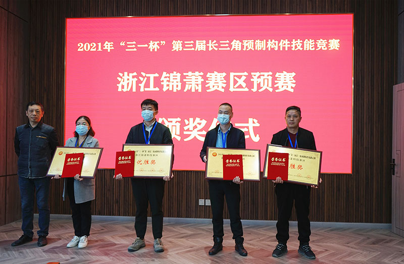 經(jīng)過激勵的角逐,最終浙江永堅新材料科技股份有限公司,錦蕭建筑科技有限公司,浙江建楓裝配式建筑科技有限公司參賽隊表現(xiàn)突出,拿下比賽前三。賽后,作為承辦方,錦蕭科技總工程師王建忠分別為獲獎參賽隊頒發(fā)了榮譽(yù)證書,同時獲得前三的參賽隊成員也將獲得由海鹽縣人力資源和社會保障局給予的獎金獎勵。