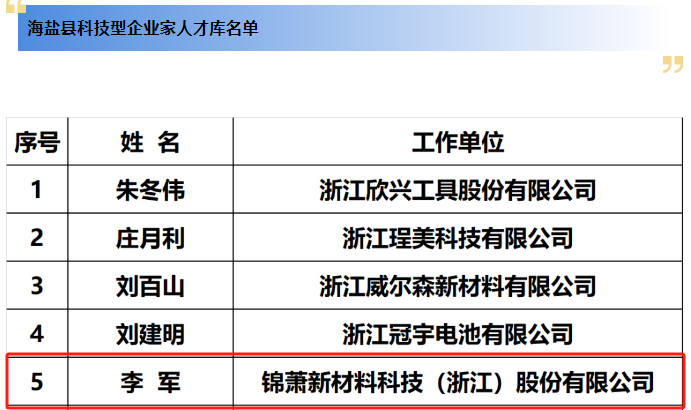 5月28日下午,嘉興海鹽圍繞“弘揚科學家精神,勇當高水平科技自立自強排頭兵”活動主題舉辦了系列主場活動,正式公布了海鹽縣科技型企業(yè)家人才庫名單、海鹽縣最具創(chuàng)新力青年科技型企業(yè)家人才庫名單,共25位優(yōu)秀企業(yè)家入庫,錦蕭科技董事長兼總經(jīng)理李軍榜上有名。