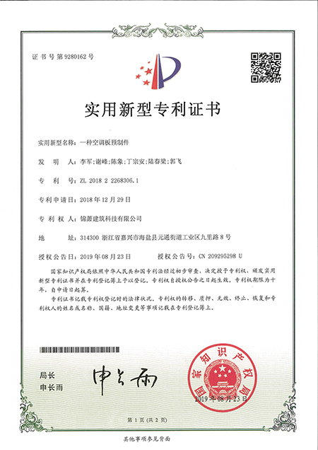 專利證書(shū)--一種空調(diào)板預(yù)制件